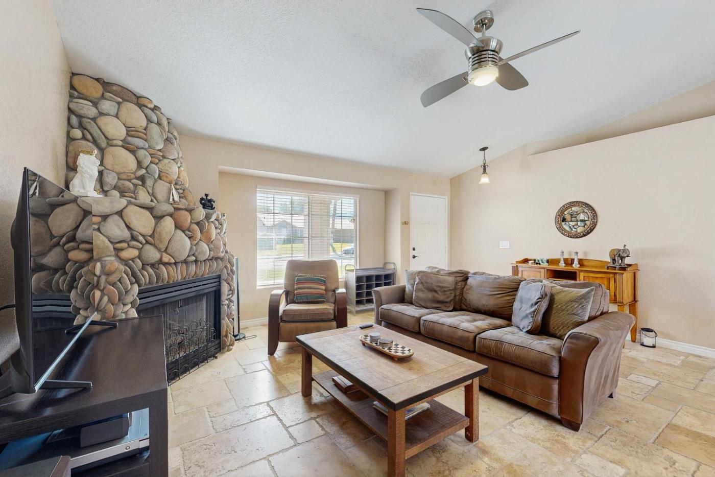 The spacious holiday home comes with 3 bedrooms, 2 bathrooms, bed linen, towels, a flat-screen TV, a fully equipped kitchen, and a patio with mountain views. There is also a seating area and a fireplace.