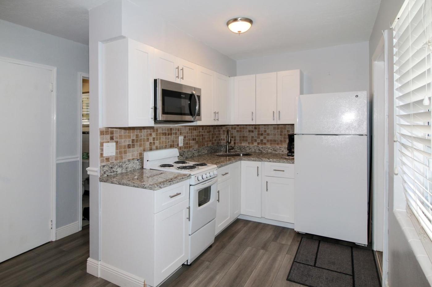 Studio Queen Deluxe. This studio features a microwave, refrigerator, and kitchenware. ;