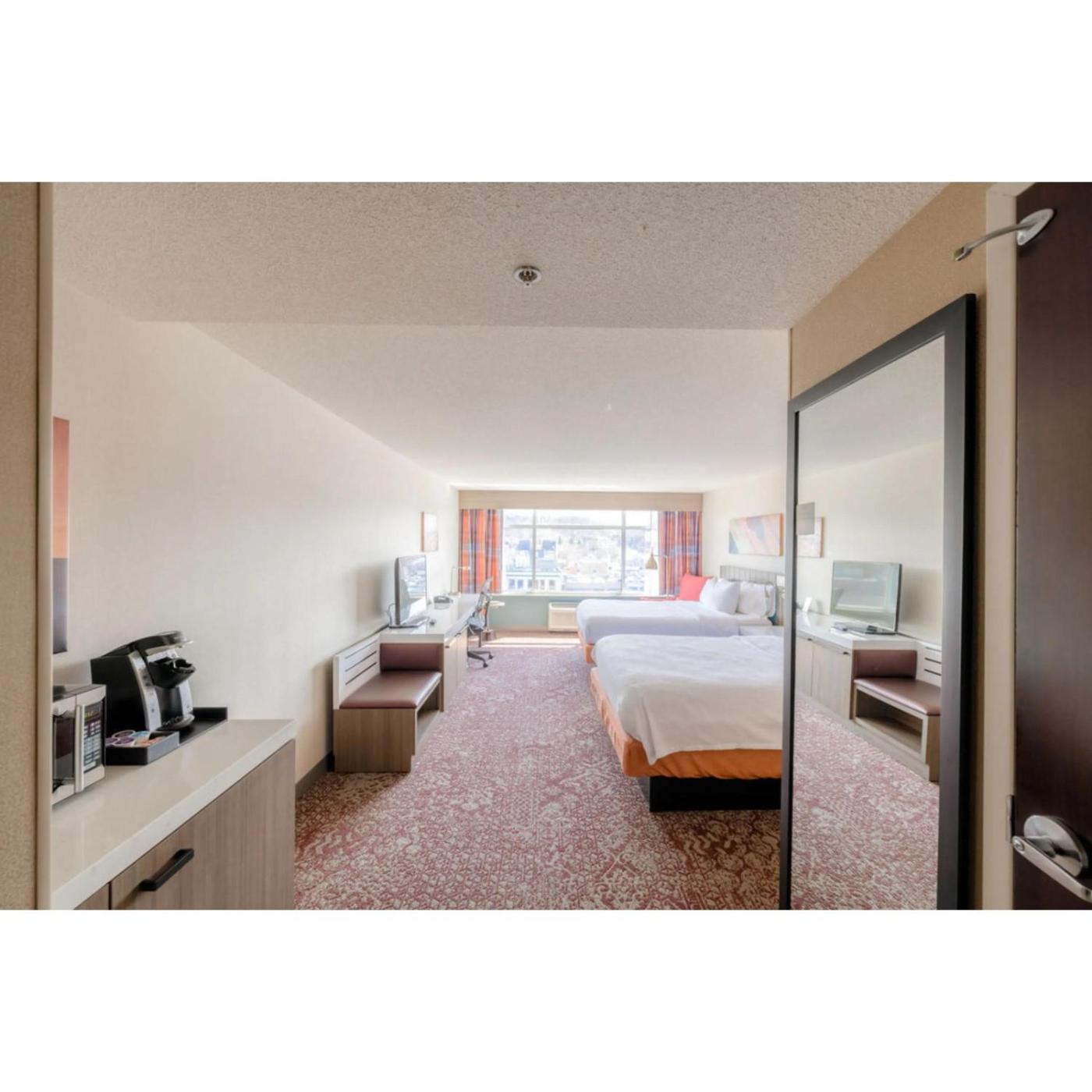 Premium Queen Room with Two Queen Beds. This family room is air-conditioned and has a flat-screen TV with cable channels, a tea and coffee maker and heating. The unit has 2 beds.