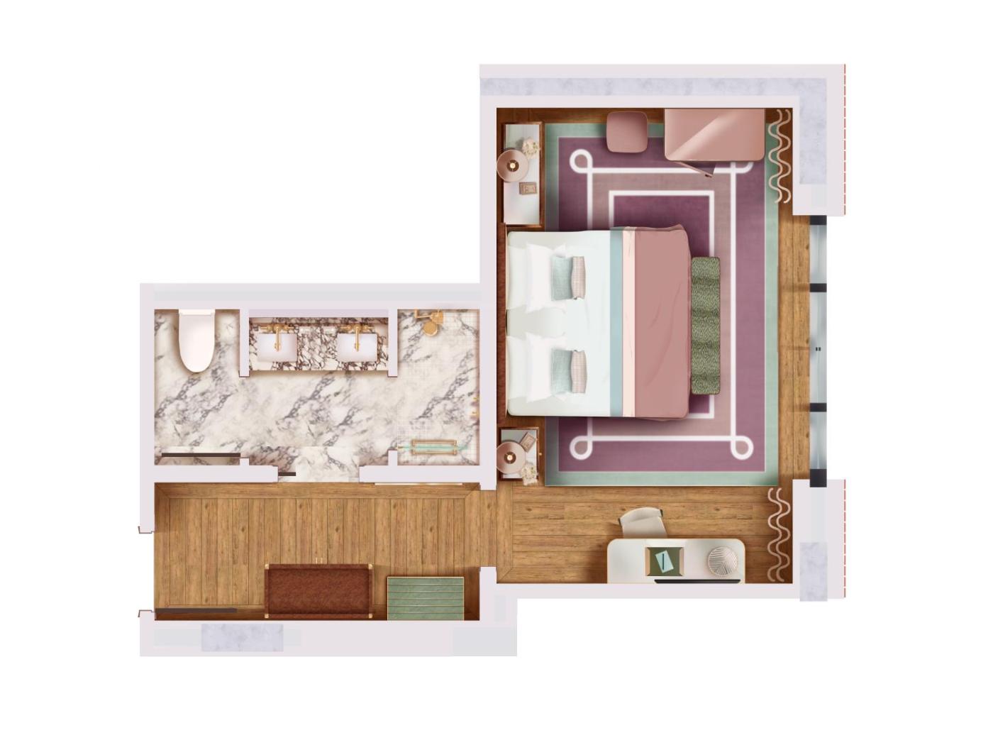 Prestige Room. Lounge in the tranquility of your room, right in the heart of Tribeca and its distinctive cobbled streets. Prestige Rooms features a king sized bed, a marble bathroom with walk-in shower, a desk and a lounge area. Each accommodation boasts floor to ceiling windows that bathe the room in natural light from sunrise to sunset for a warm, and welcoming atmosphere. ;