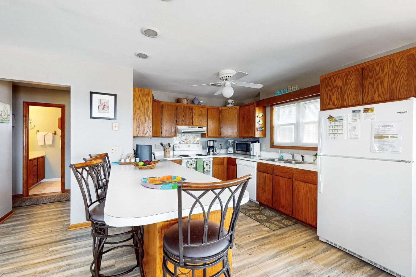 Four-Bedroom House. This spacious holiday home is comprised of 4 bedrooms, kitchen and 3 bathrooms with a shower. The fully equipped kitchen features a stovetop, a refrigerator, a dishwasher and kitchenware. The air-conditioned holiday home offers a TV, a washing machine, a tea and coffee maker, a dining area as well as sea views. The unit offers 7 beds.
