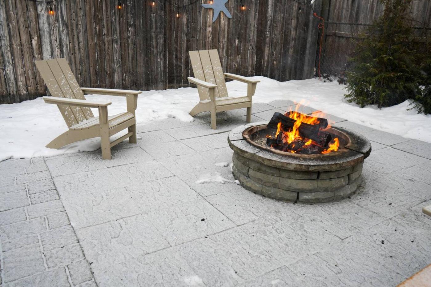 Guests can relax near the outdoor fireplace at the holiday home.