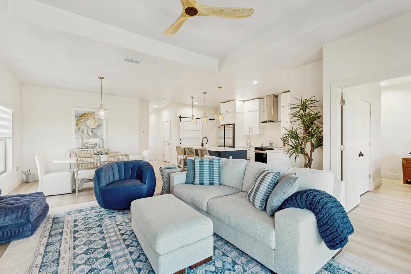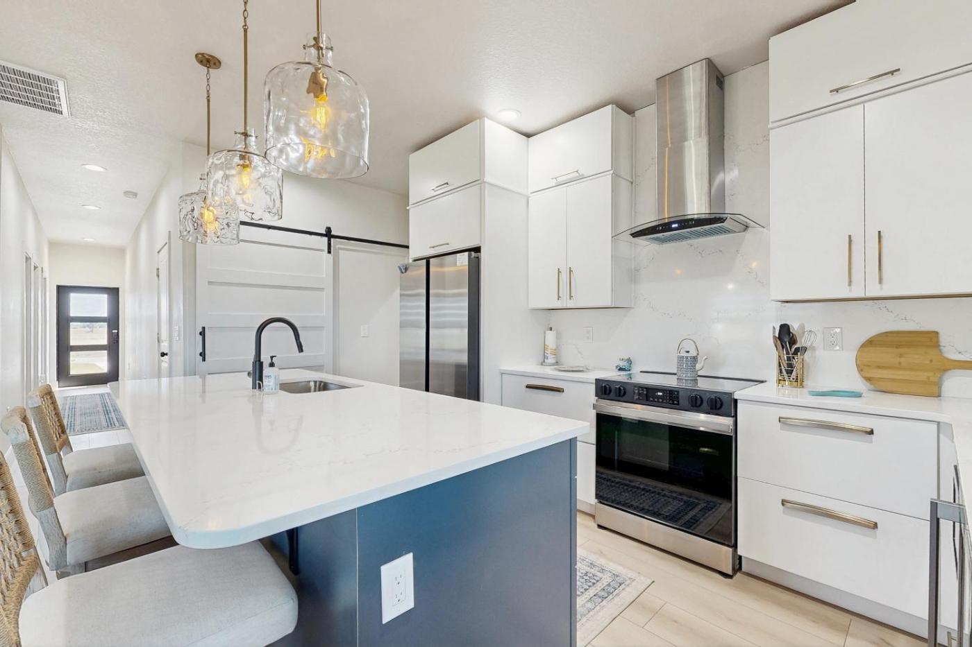 Three-Bedroom House. Boasting a private entrance, this spacious holiday home also features 3 bedrooms, a seating area and 2 bathrooms with a walk-in shower and a bath. Guests can make meals in the kitchen that has a stovetop, a refrigerator, a dishwasher and kitchenware. The air-conditioned holiday home features a TV with streaming services, a washing machine, a tea and coffee maker, a dining area as well as lake views. The unit has 4 beds.
