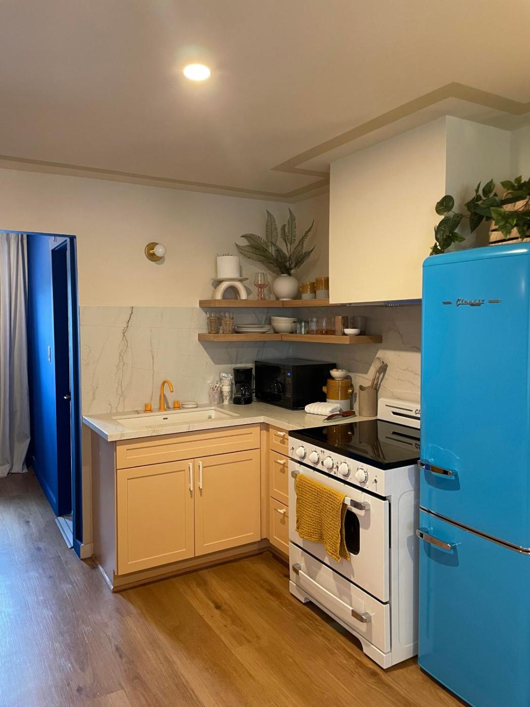 Queen Room. Featuring free toiletries, this double room includes a private bathroom with a shower. The well-fitted kitchen has a stovetop, a refrigerator, kitchenware and a microwave. The spacious double room features air conditioning, a private entrance, a tea and coffee maker, parquet floors and a flat-screen TV with cable channels. The unit has 2 beds.